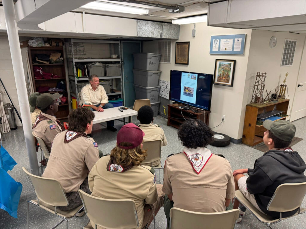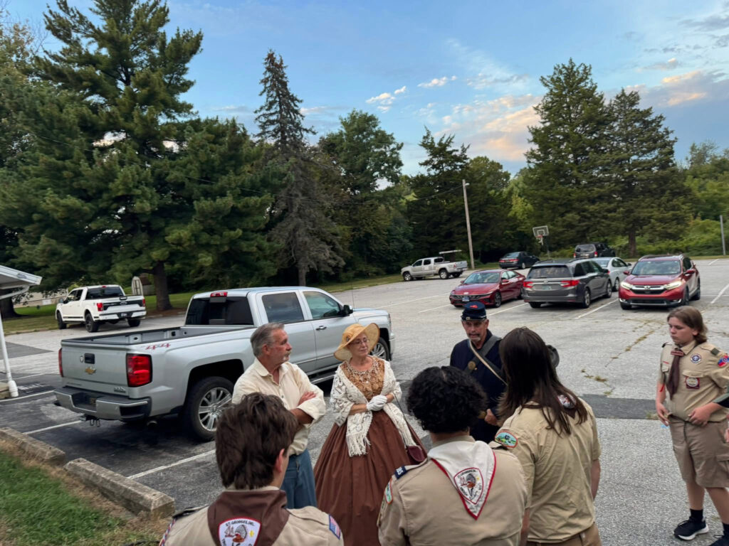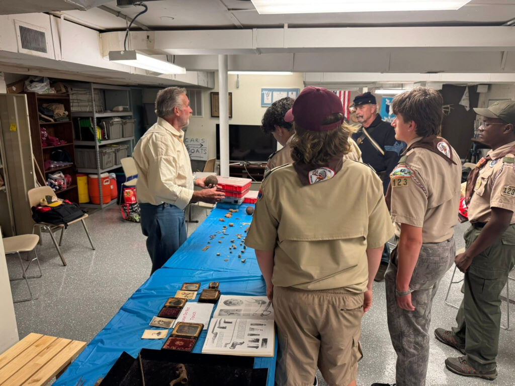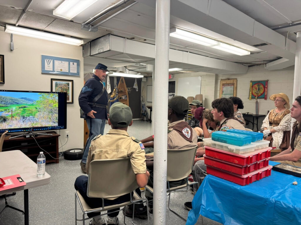 Spent Monday evening with Boy Scout Troop 123 in St. George’s Delaware – invited by Scout leader Matt Gessner to give a presentation on what soldier life was like during the Civil War. The troop, along with other troops will be camping on a farm at Gettysburg, I forget which one unfortunately, and wanted to have an understanding of what the men went through back then. Bill Purdy from the second Delaware Reenactors volunteered to help along with his wife Renate Leuprecht Purdy in period clothing. I gave the young men a general quiz and brought along hands on artifacts for them to enjoy. It was a good evening. (Photo credits: Matthew Gessner)